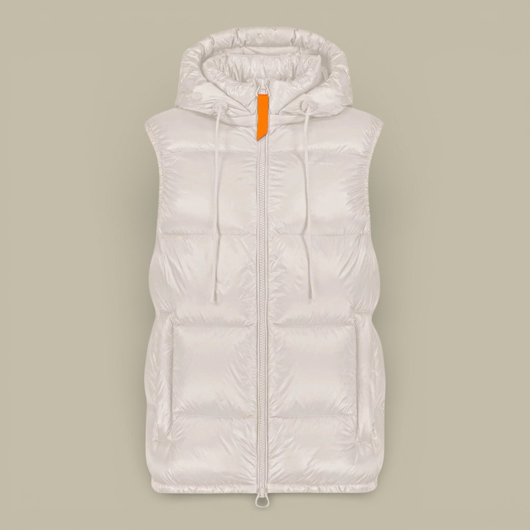 Cette doudoune sans manches offre chaleur et légèreté grâce à son garnissage en duvet naturel. Son tissu déperlant protège efficacement des intempéries, tandis que sa coupe moderne et sa teinte « lune » apportent une allure chic et intemporelle.