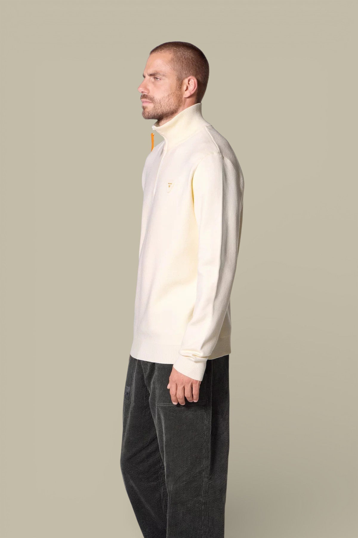 LEWIS est un pull camionneur unisexe ample, confectionné en maille jacquard. Les manches tombantes et le bas du vêtement sont resserrés grâce à une finition en rib. Le col s’ouvre avec un zip en plastique injecté et une tirette contrastée. Le logo de la marque apparaît sur le devant du pull en négatif. Le logo de la marque apparaît en contrasté sur le milieu devant. Le patch iconique de la marque en silicone ton sur ton est cousu sur l’épaule.